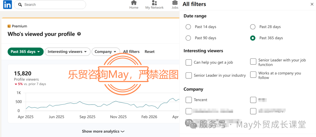 Who’s viewed your profile | LinkedIn Tips shared by May Shi这个 Interesting viewers 里的线索还是非常有用的,尤其是下面 2 个:Senior Leader in your industry, Works at a company you follow。