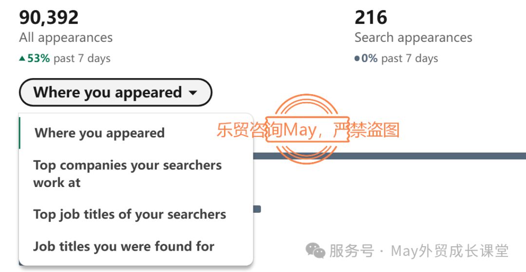 Profile Appearances = 你的名字 + Headline 在平台上”被看到”的次数
